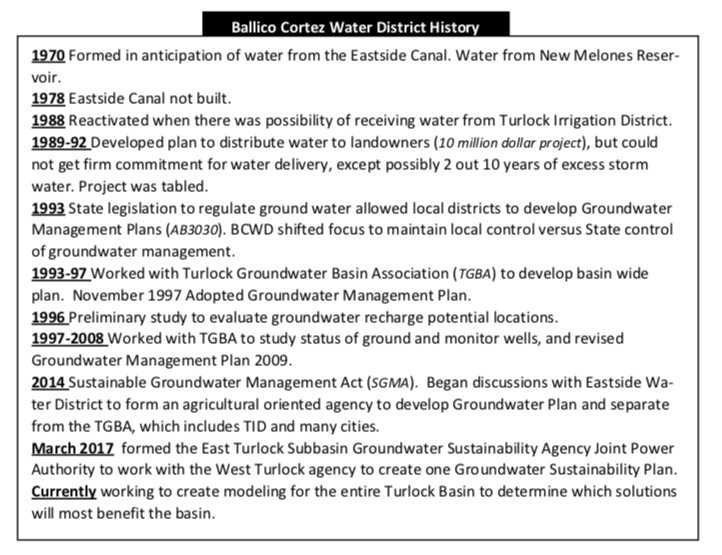 Ballico Cortez Water District (BCWD) is approximately 6,800 acres located in the region that is north of the Merced River and up to the Merced county line. Although a small district, we are made up of farmers within Merced County that helps make this county the sixth top producing agricultural county in California.